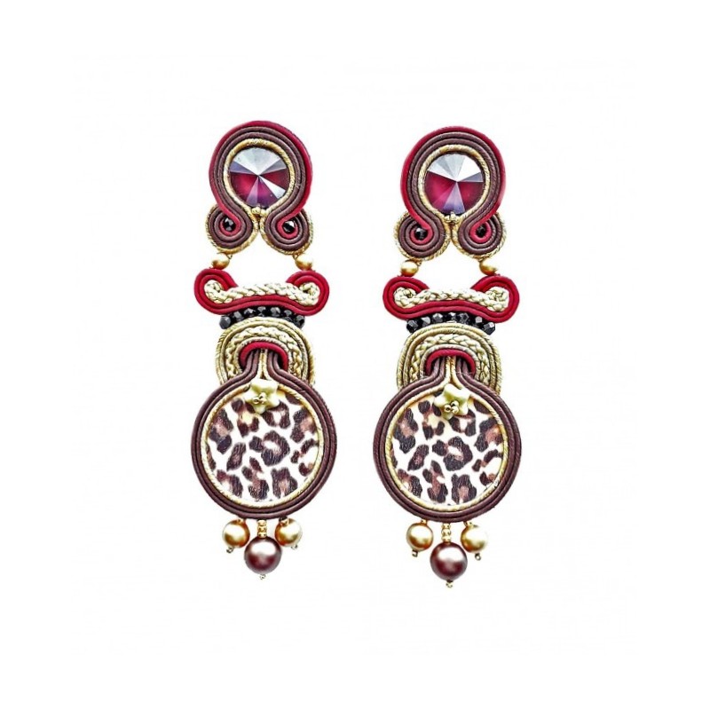 Hand embroidered earrings with beautiful wooden cabochon, Swarovski crystals, miyuki beads and textile cords.