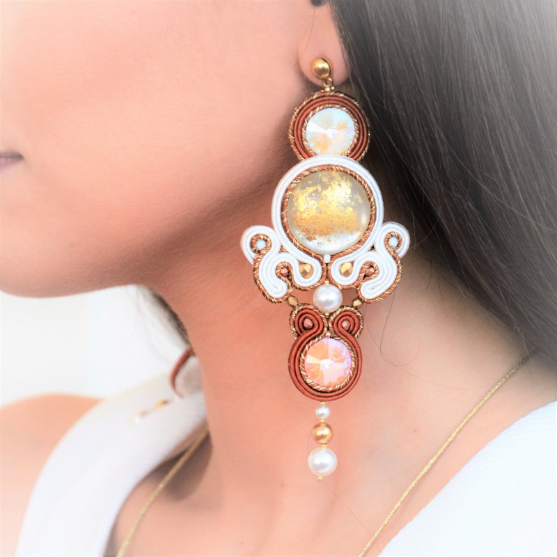 Hand embroidered earrings with beautiful hand painted cabochon with gold leaf 22K, Swarovski crystals, Swarovski pearls, textile cords, glass & miyuki beads