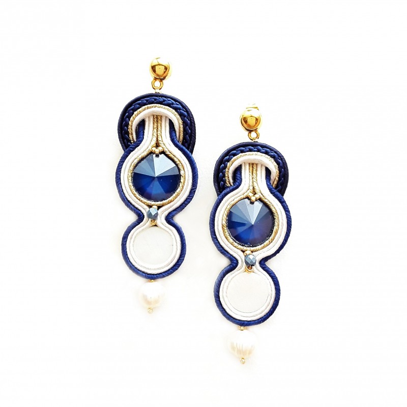 Hand embroidered earrings with Swarovski rivoli, mother of pearl cabochon, freshwater pearl, textile cords, crystals & miyuki beads.