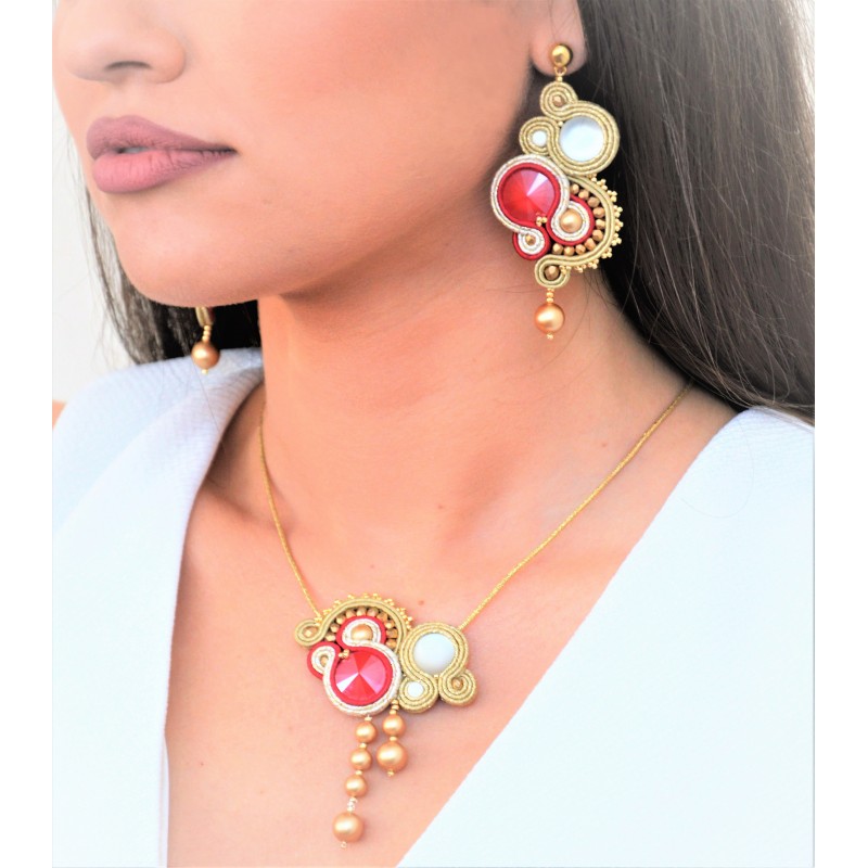 Hand embroidered earrings with Swarovski crystals, Swarovski pearls, glass & miyuki beads, textile cords.