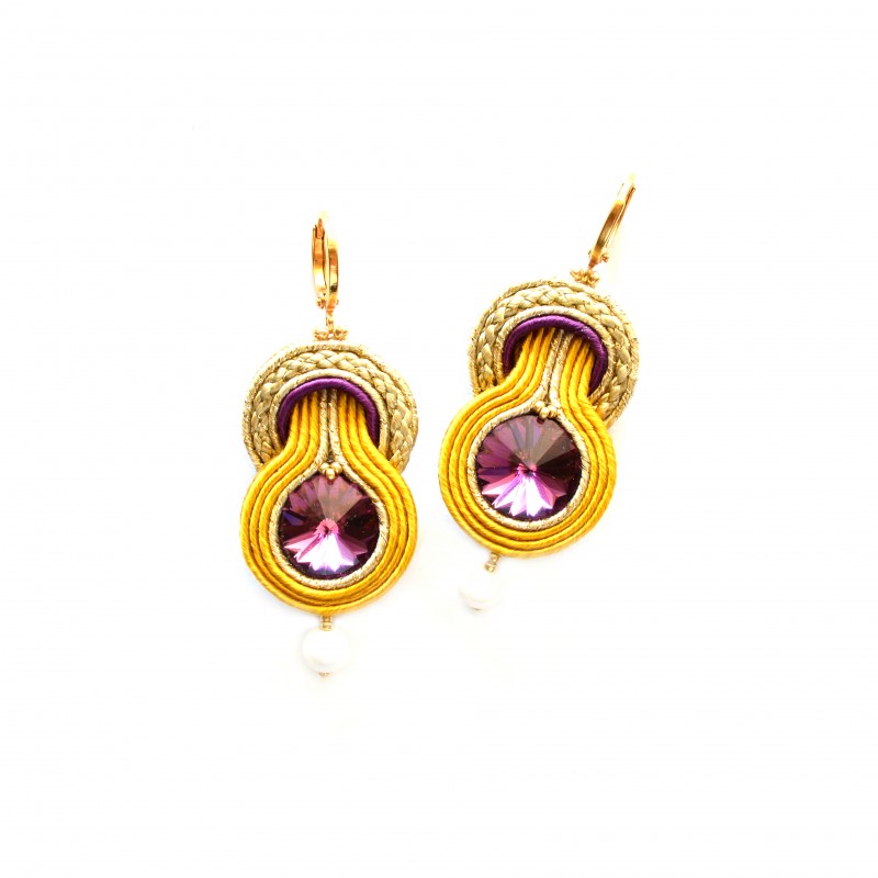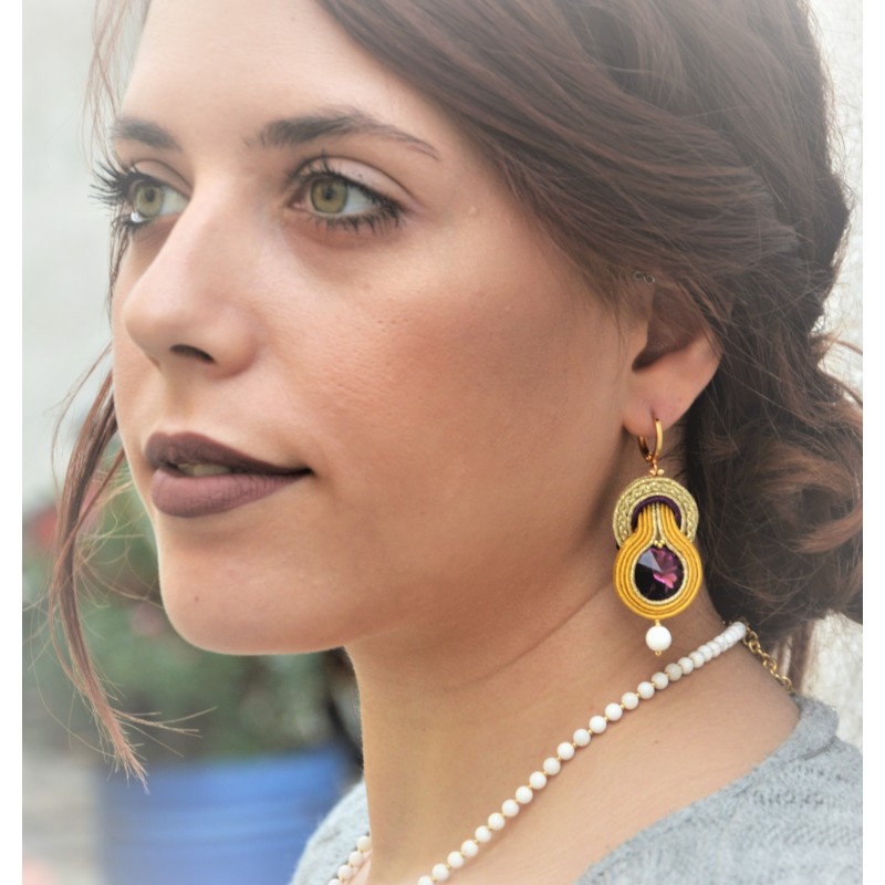 Hand embroidered earrings with Swarovski rivoli, crystals & miyuki beads, textile cords