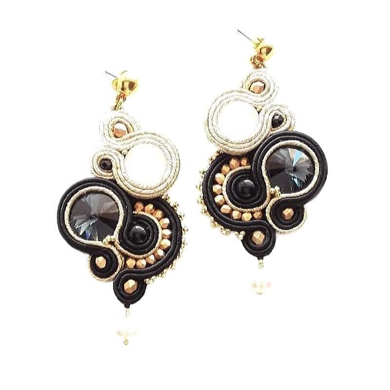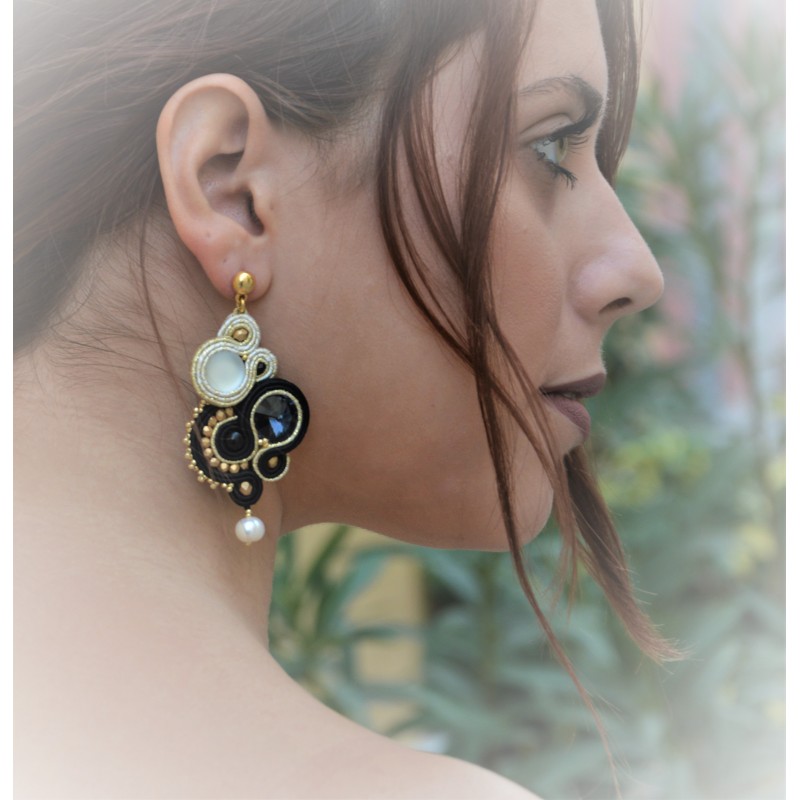 Hand embroidered earrings with Swarovski crystals, freshwater pearls, glass & miyuki beads, textile cords