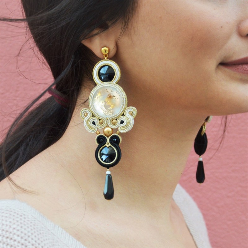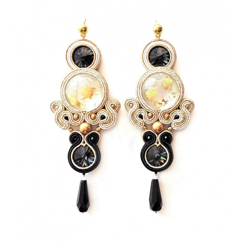 Hand embroidered earrings with beautiful hand painted cabochon with gold leaf 22K, Swarovski crystals, Swarovski pearls, textile cords, glass & miyuki beads