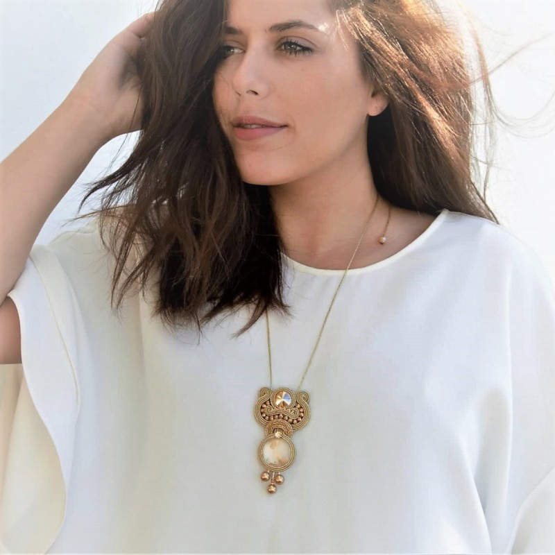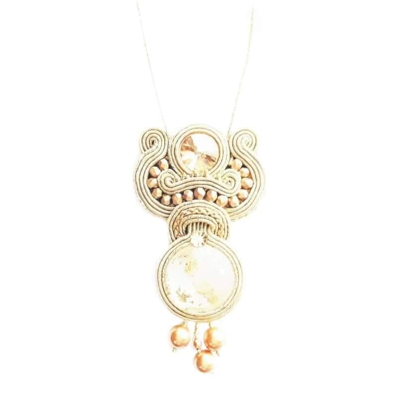 Hand embroidered long necklace with Swarovski crystal, Swarovski pearls, crystals & miyuki beads and beautiful hand painted cabochon with gold leaf 22K.
