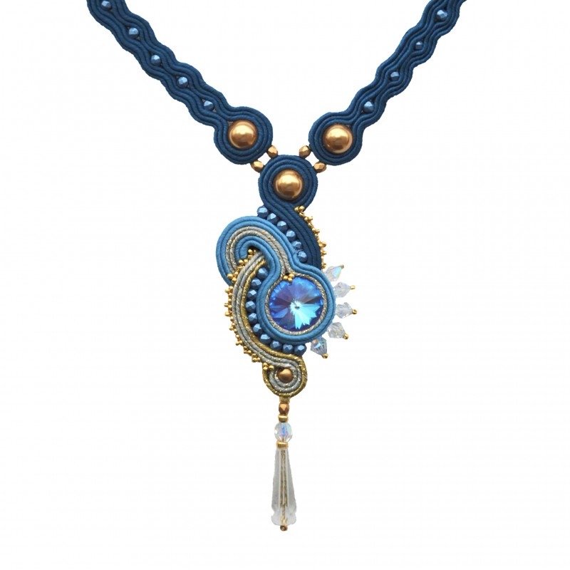 Hand embroidered necklace with Swarovski crystals, beautiful wooden cabochon, Swarovski pearls, textile cords, glass & miyuki beads