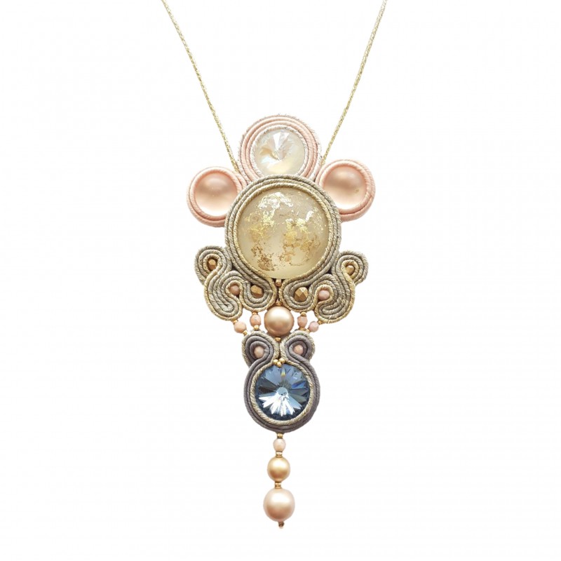 Hand embroidered long necklace with Swarovski crystals, beautiful hand painted cabochon with gold leaf 22K, Swarovski pearls, textile cords, glass & miyuki beads