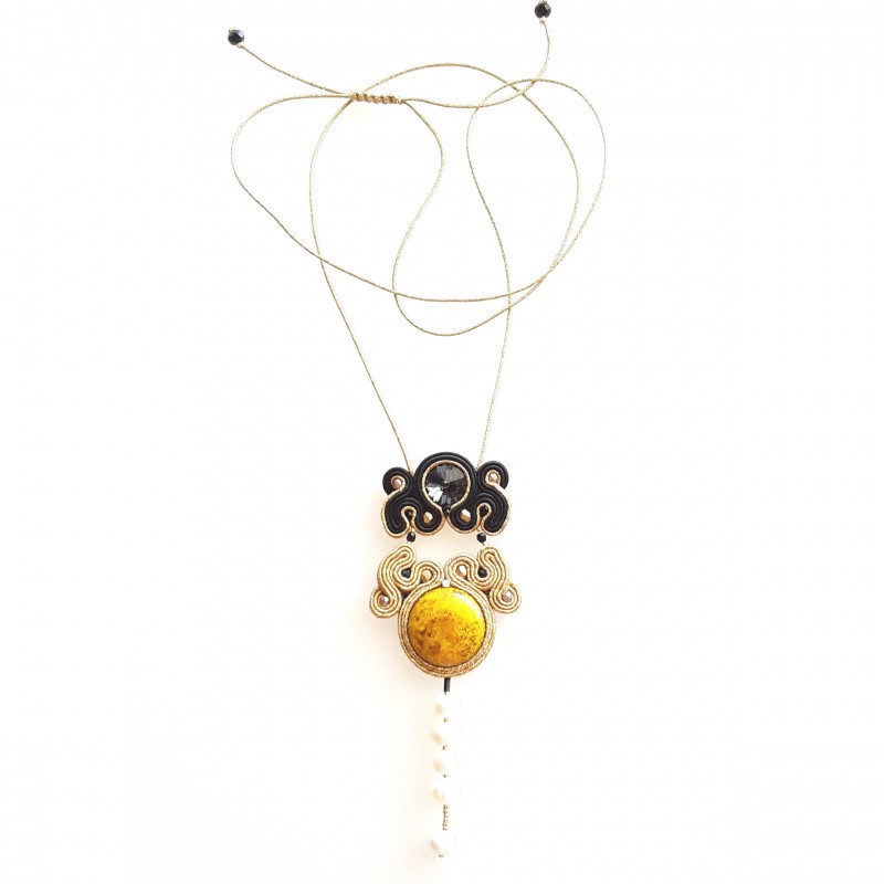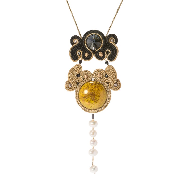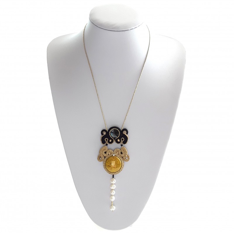 Hand embroidered long necklace with Swarovski crystal, freshwater pearls, crystals & miyuki beads, beautiful glass cabochon, textile cords.