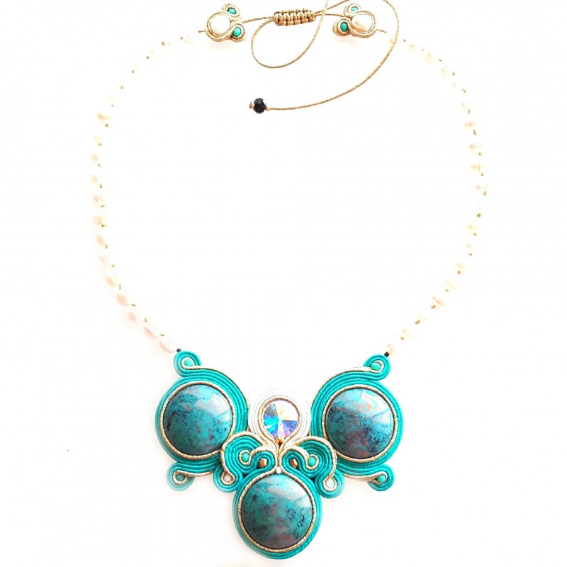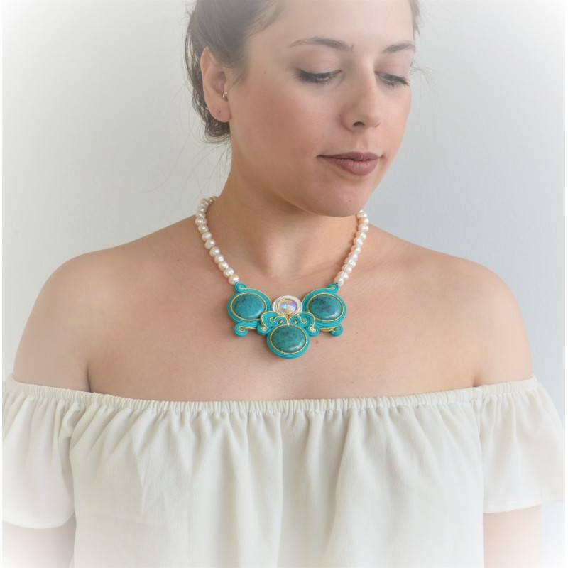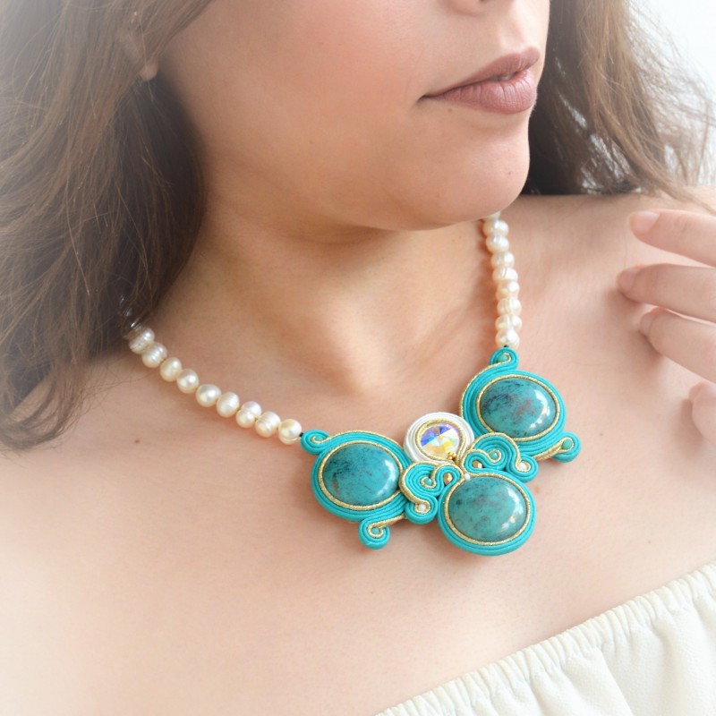 Hand embroidered necklace with Swarovski crystal, freshwater pearls, crystals & miyuki beads, beautiful glass cabochon, textile cords.